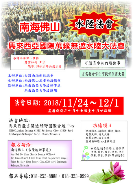 | 107.11.05 | 107.11.24至107.12.01日 法會活動:南海佛山水陸法會-馬來西亞國際萬緣無遮水陸大法會 圓滿 | |