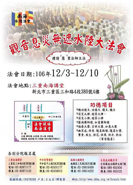 | 106.10.22 | 106/12/03~106/12/10日 法會活動:觀音息災無遮水陸大法會 圓滿 |