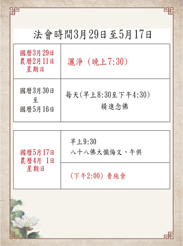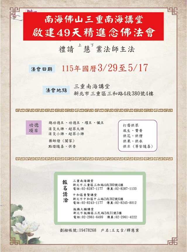 | 115.1.27 | 115年03月29日至5月17日 法會:南海佛山三重南海講堂49天精進念佛法會 | |