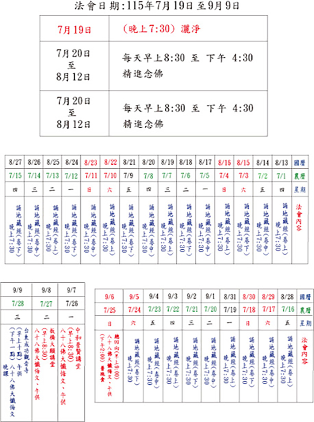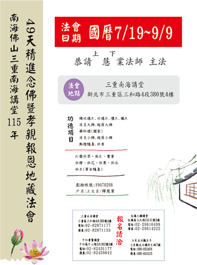 | 115.1.27 | 115年07月19日至9月9日 法會:南海佛山 三重南海講堂49天精進念佛暨孝親報恩地藏法會 | |